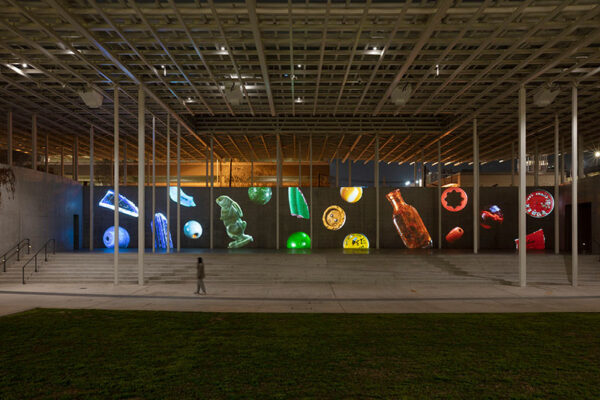 The giant video projection of artifacts in Past Deposits is in constant conversation with the pedestrians, roadways, and architecture that surround it.